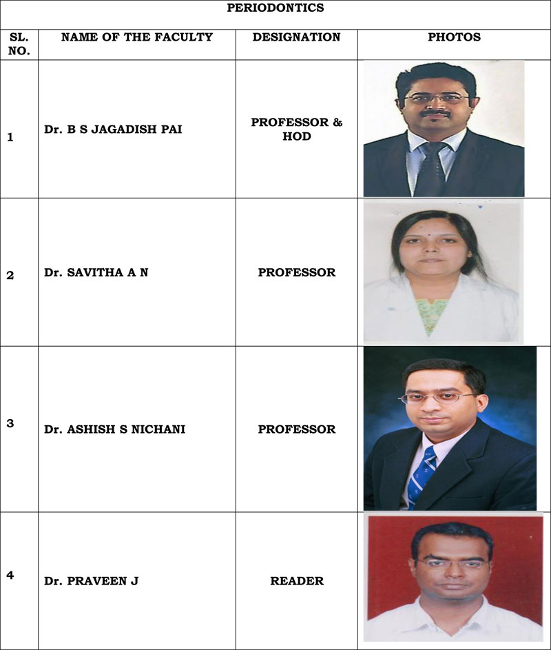 The department is having dedicated faculty members who are instrumental in teaching underdraduate and postgraduate students as well as in providing services of all aspects of periodontology to rural, urban and semi urban population.