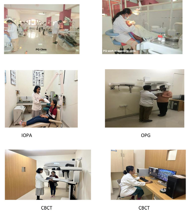 The postgraduate clinic has 20 fully functional dental chairs with the ground area of 2538 sq ft. The daily schedule of a post graduate student starts with a previously decided presentation topic. This is followed by a detailed clinical evaluation of the patient with necessary records which is reconfirmed by competent faculty members, after which there is a detailed discussion of the case among the staff and students.