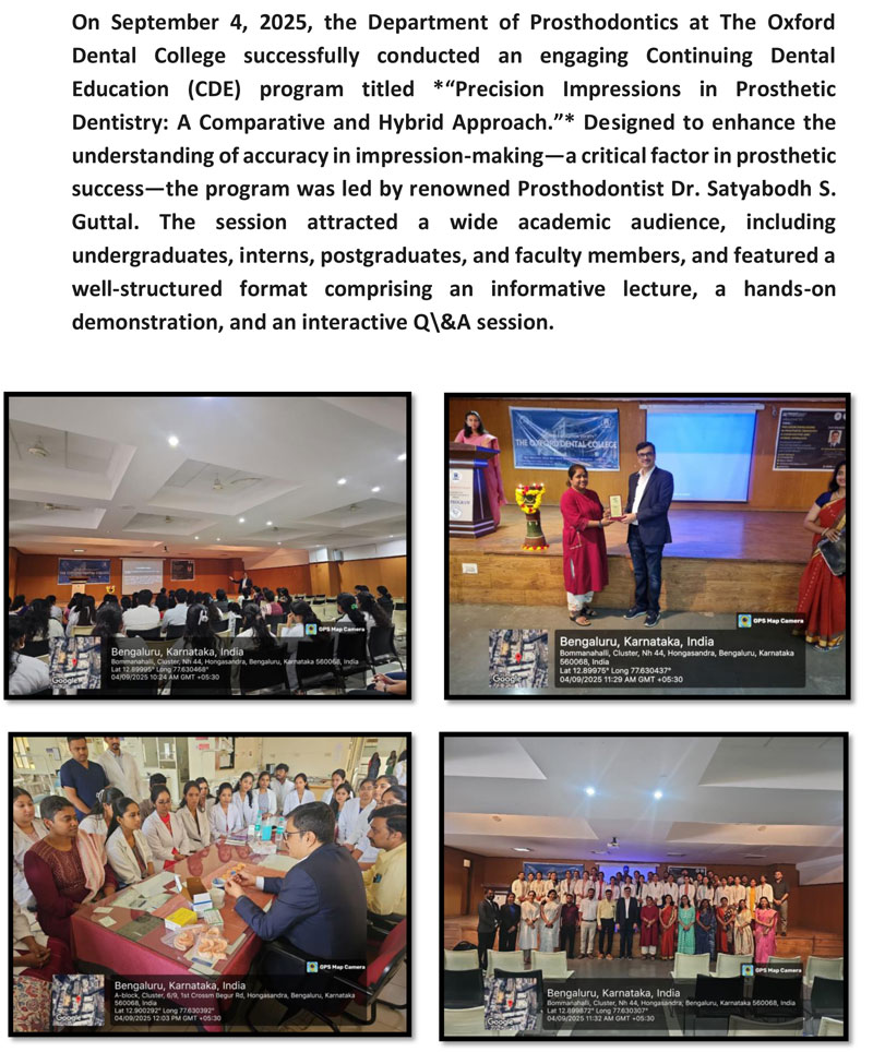 The Department of Periodontology in association with Kovident and Gigaalase conducted a skill training program and CDE program on 23rd April 2024. Over 50 people participated in the program and the participants came from colleges all over Karnataka and Kerala. Dr Jagdish Pai (Professor and Head, Department of Periodontology, The Oxford Dental College) and Dr Praveen J (Reader Department of Periodontology, The Oxford Dental College) were the resource people. This one-day program encompassed lectures, hands-on and patient demonstrations. The program was well received and appreciated by all.
